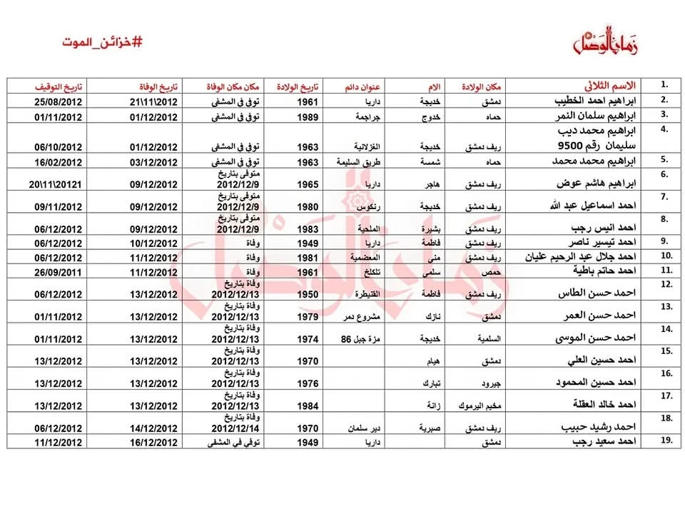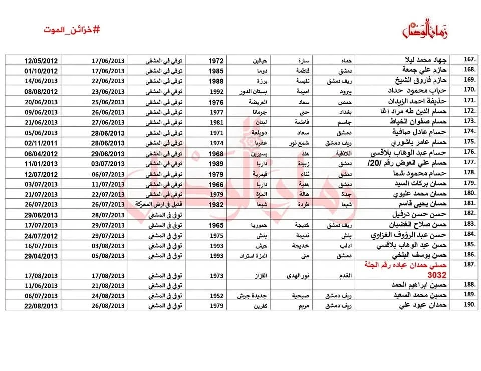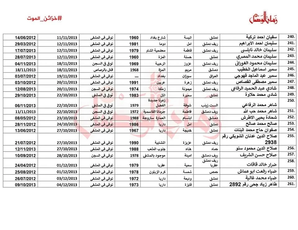 كشفت صحيفة "زمان الوصل" عن قائمة صادمة تضم أسماء وتواريخ اعتقال وتصفية 582 مواطنًا سوريًا، بينهم أطفال، قضوا في سجون المخابرات الجوية التابعة للنظام السوري بين عامي 2011 و2014، في واحدة من أكثر الفترات دموية في البلاد.