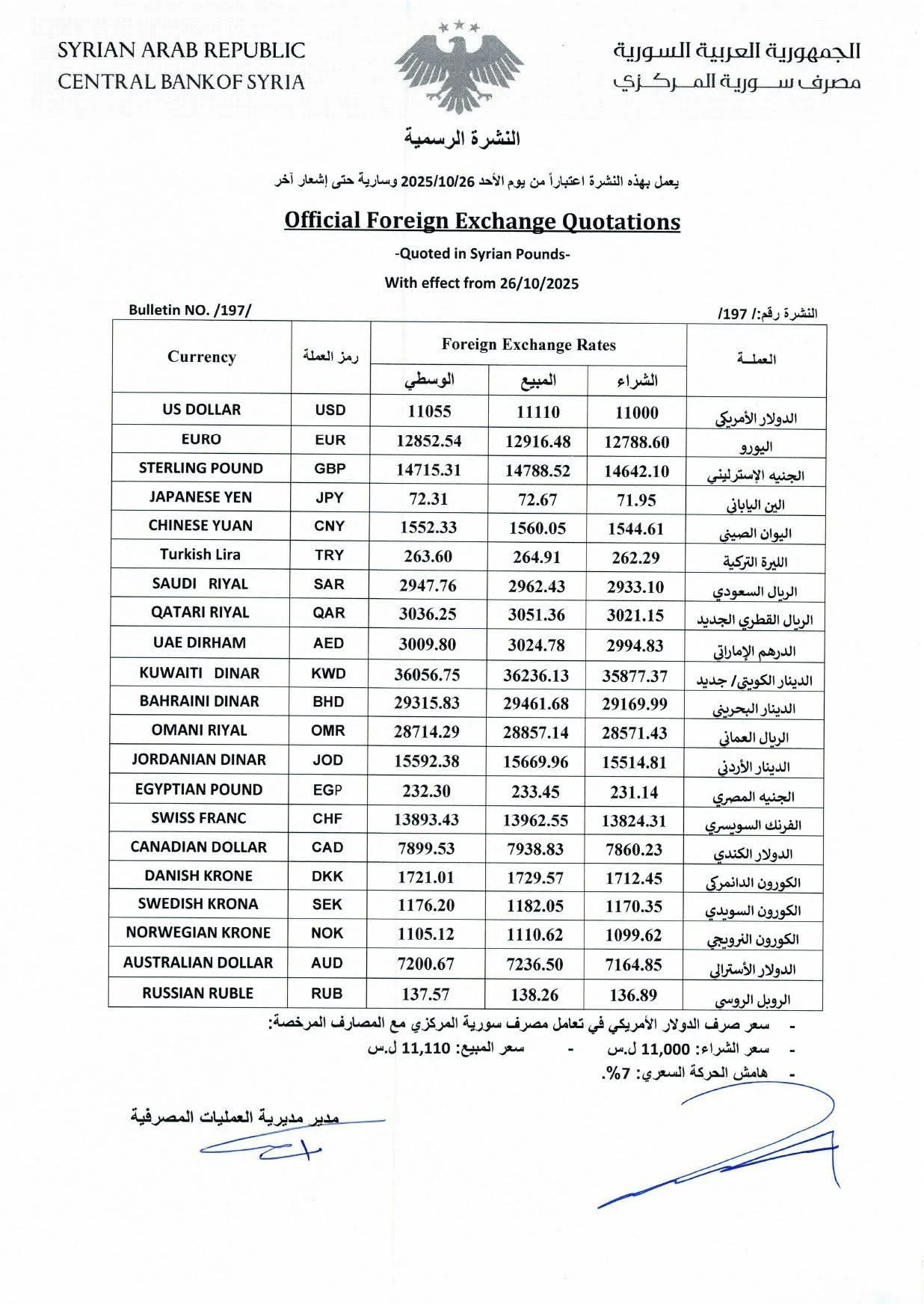 أعلن مصرف سورية المركزي في نشرته الرسمية الصادرة اليوم الأحد 26 تشرين الأول 2025 عن تحديد أسعار صرف العملات الأجنبية مقابل الليرة السورية، حيث بلغ سعر صرف الدولار الأميركي 11,000 ليرة شراءً و11,110 ليرة مبيعاً.