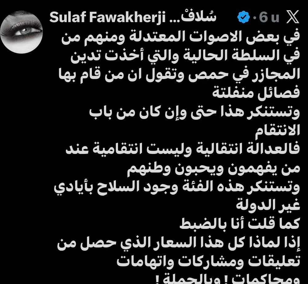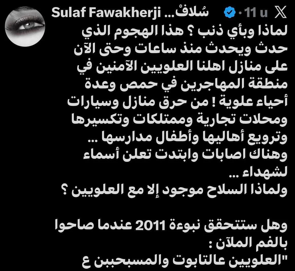 وتناول الجدل منشورات وُصفت بأنها تحريضية عبر استحضار عبارات مثل "العلويين عالتابوت"، ما اعتبره متابعون محاولةً لإحياء خطاب الكراهية في وقتٍ تشهد فيه حمص توتراً على خلفية حرق منازل وممتلكات، وهي أعمال أدانها ناشطون وحقوقيون بوصفها تهديدًا للسلم الأهلي.