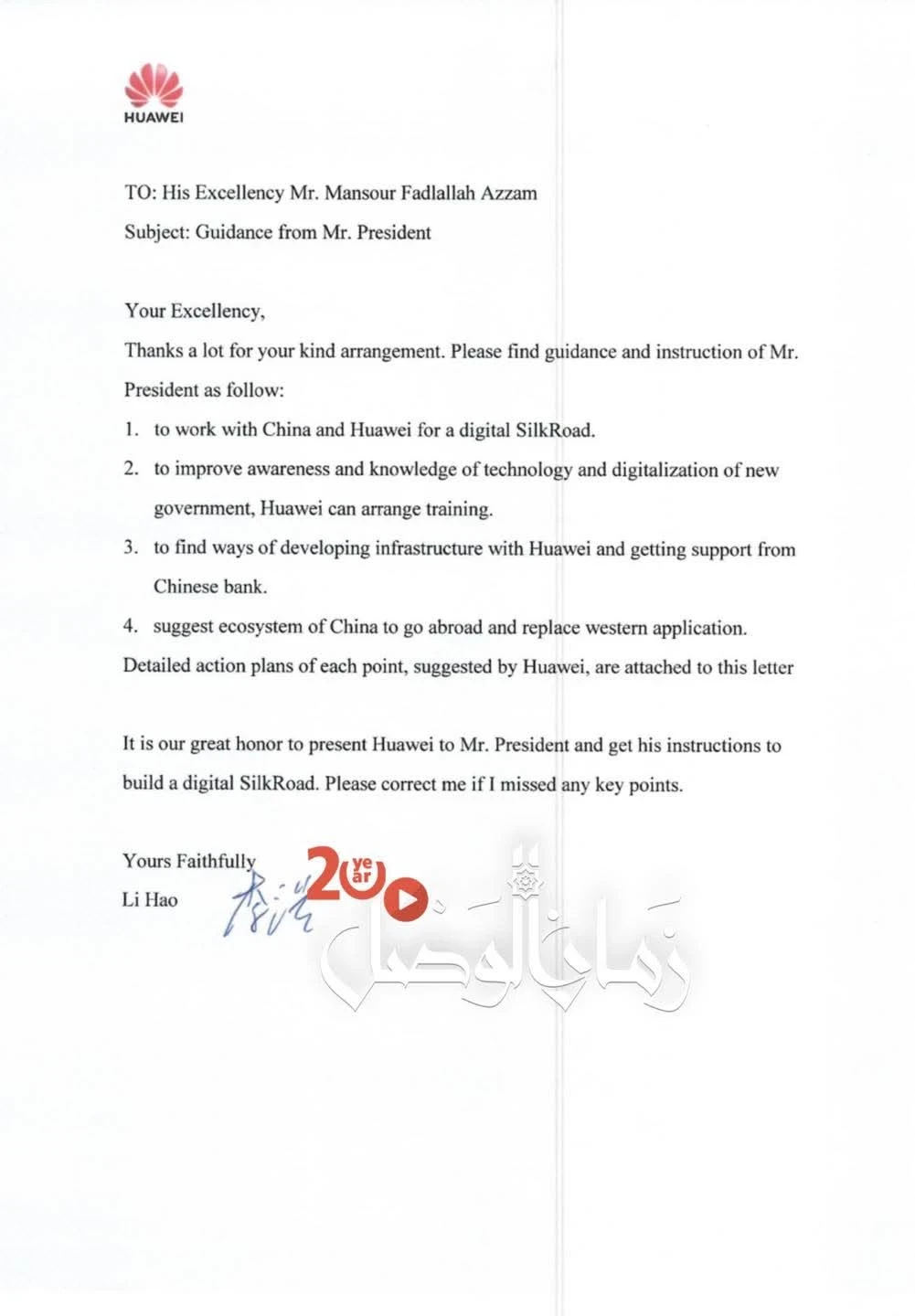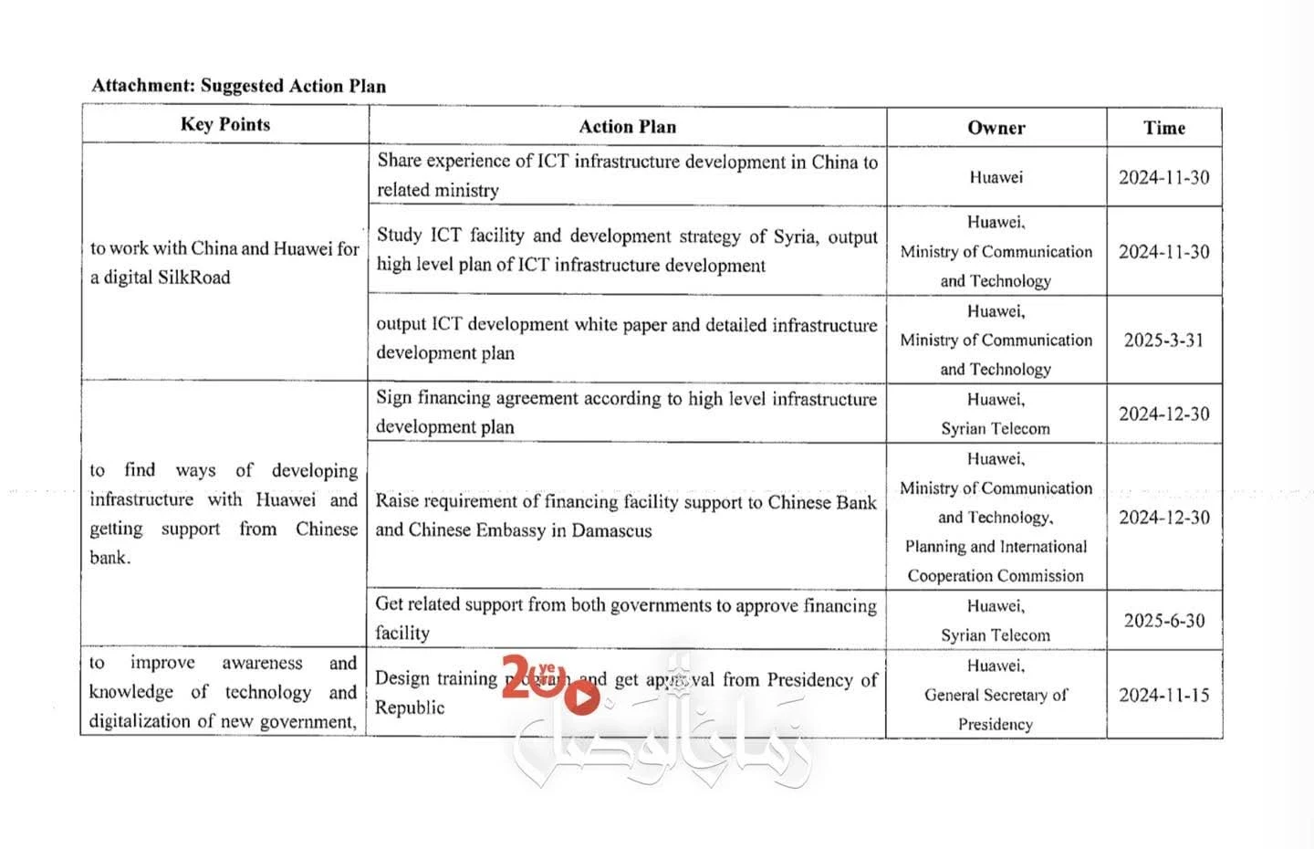 وبيّنت الوثيقة، المرسلة من شركة "هواوي" إلى مسؤول حكومي سوري رفيع، أنها تستند إلى "توجيهات رئاسية" مباشرة، ما يعكس تبنّي القيادة السورية للمشروع على أعلى مستوى.