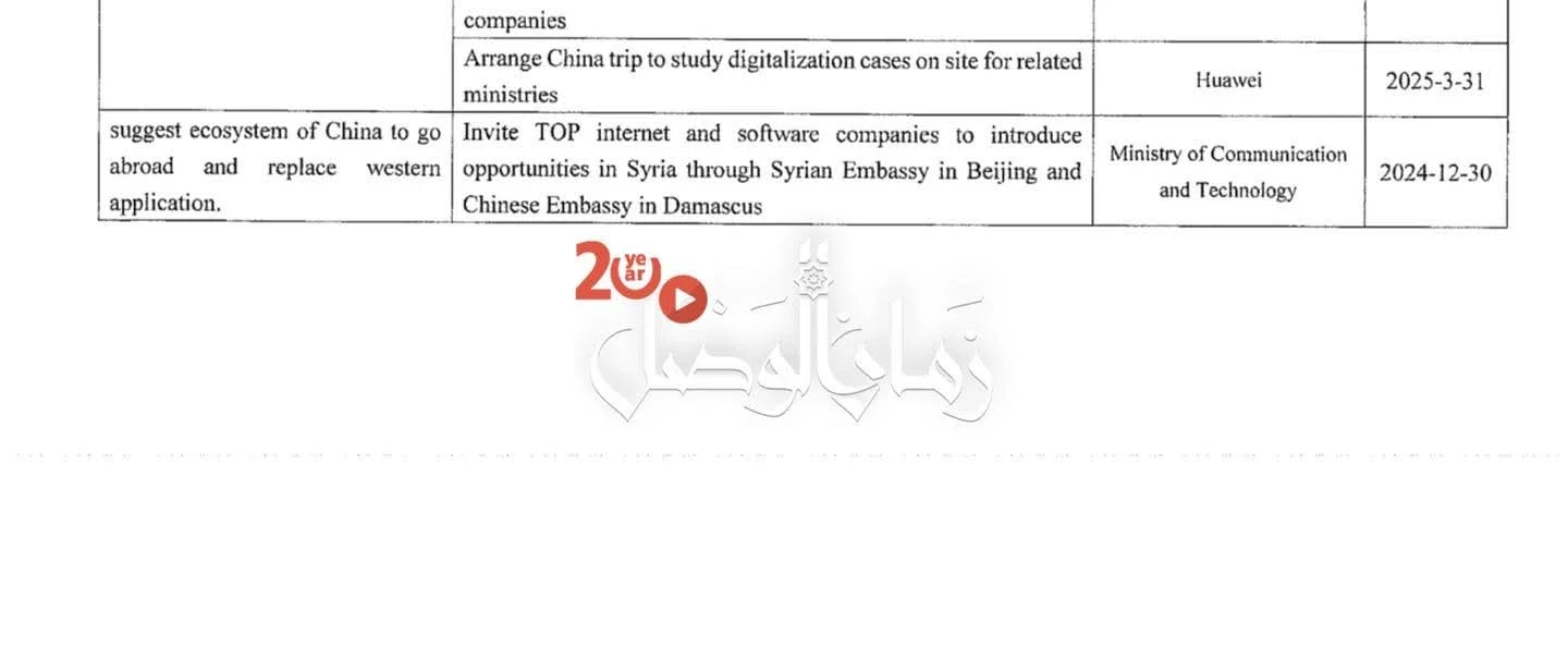 أظهرت وثيقة مسرّبة وجود خطة استراتيجية كان من المقرر تنفيذها في سوريا بتاريخ 30/11/2024، تقوم على تحويل البنية التحتية والبيئة الرقمية في البلاد إلى نموذج صيني متكامل ضمن مشروع "طريق الحرير الرقمي".