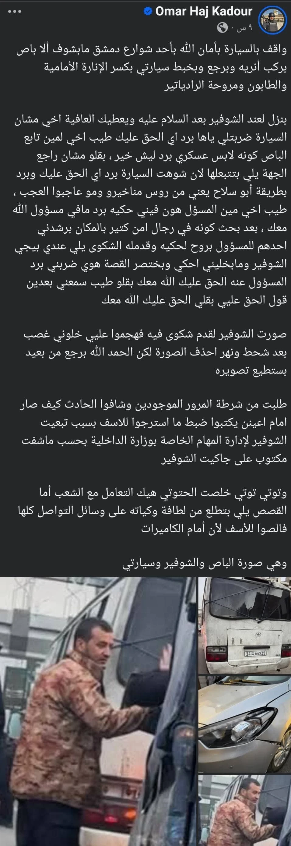 وأوضح حاج قدور، في منشور على حسابه في فيسبوك، أن باصاً تابعاً لـ«إدارة المهام الخاصة» في وزارة الداخلية اصطدم بسيارته المتوقفة، ما تسبب بأضرار مادية، مشيراً إلى أن محاولته تقديم شكوى رسمية قوبلت برفض وعدائية من السائق والمسؤولين في المكان، الذين كرروا عبارة «الحق عليك» دون الاستماع لتفاصيل الحادث.