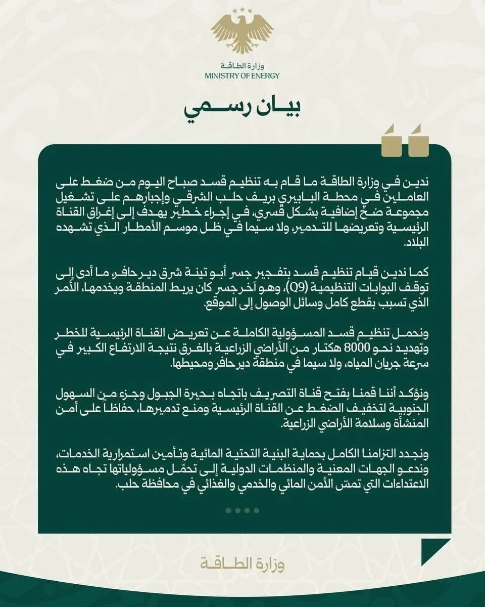 أصدرت وزارة الطاقة بيانًا رسميًا أدانت فيه ضغوط تنظيم"قسد" على العاملين في محطة البابيري، وإجبارهم على تشغيل مجموعة ضخ إضافية بشكل قسري، ما يهدد بإغراق القناة الرئيسية وتعريضها للتدمير.